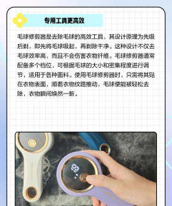 去除衣物毛球的方法包括使用电动剃须刀、大胶带或毛球修剪器。毛球修剪器操作简单,将衣物平铺,推启开关,来回移动修剪即可。注意避免在毛线打结处用力过猛,以免损坏衣物。