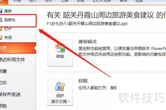 以PPT2010为例,打开需复制文字的演示文稿,点击左上角文件菜单,选择另存为即可。
