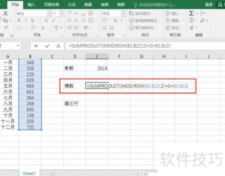 在Excel工作表中,于指定单元格输入公式:=SUMPRODUCT((MOD(ROW(B1:B12),2)=0)*B1:B12),用于计算B1至B12区域中偶数行数据的和,实现隔行求和功能,所示。