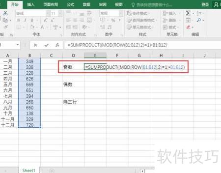 在Excel工作表单元格中输入公式:=SUMPRODUCT((MOD(ROW(B1:B12),2)=1)*B1:B12),用于对B1至B12区域中奇数行的数据进行求和,即实现隔行求和(奇数月)。所示。