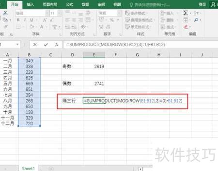 若需每隔三行求和,如一、四、七、十月份之和,可使用公式:=SUMPRODUCT((MOD(ROW(B1:B12),3)=0)*B1:B12)。
