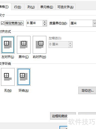 表格属性设置页面支持精确调整表格宽度,提供厘米和百分比两种单位。百分比表示表格宽度占页面宽度的比例,例如50%即表格宽度为页面宽度的一半。