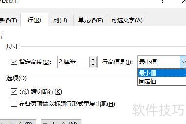 最小值:表示该行在无内容时的最低高度;固定值:指该行高度恒定,不随内容增减变化,文字过多时可能无法完整显示。见下图示例。