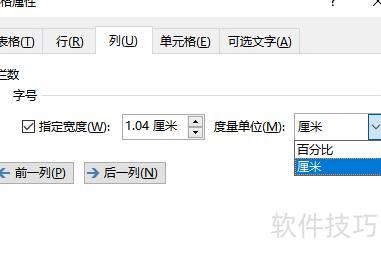 此处度量单位包括百分比和厘米,百分比指该列宽度占表格总宽度的比例。