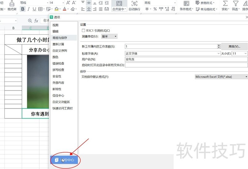3. Excel表格自动保存时,会弹出选项详情,接着点击下方的备份中心,具体位置请参考我标注的箭头和红圈。