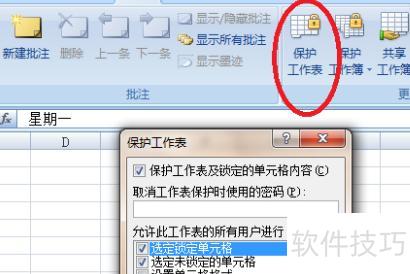 点击审阅菜单中的保护工作表,在弹出窗口输入密码完成设置。