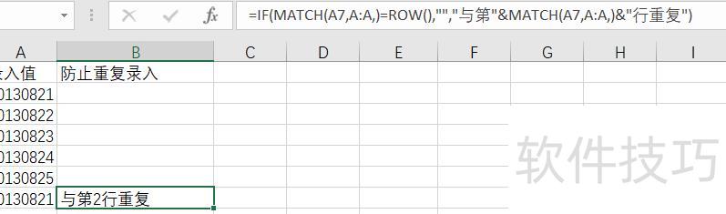 为防止重复输入或粘贴,若数据从A2开始(范围为A2:A7),可在B2单元格输入公式:=IF(MATCH(A2,A:A,)=ROW(),,与第&MATCH(A2,A:A,)&行重复),然后将该公式向下复制至A列数据末尾,即可自动提示与哪一行数据重复。