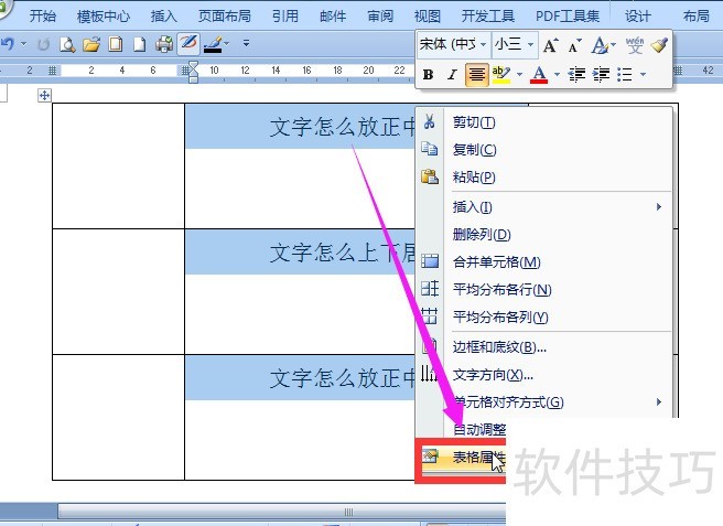 接下来以Word2007为例,演示如何将表格中的文字设置为上下居中对齐。