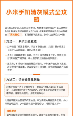 手机清灰可通过软毛刷、棉签或吹风机(冷风档)清理听筒、扬声器和充电口等部位。外部清洁可用柔软湿布或专用清洁剂擦拭,避免使用尖锐工具以防损坏。