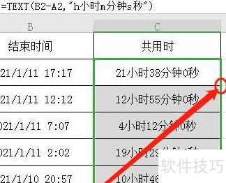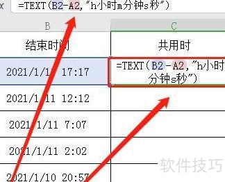 选中C2单元格,输入公式=TEXT(B2-A2,h小时m分钟s秒),然后按下回车键确认。