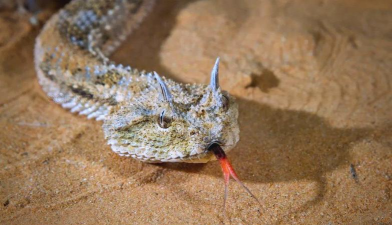 非洲角蝰蛇: 外貌特征:非洲角蝰蛇的身体呈浅沙色,杂有深色斑点或横斑。它们的双眼上方各有一对竖立的刺状角鳞,因此容易辨认。头部有一对角,不仅是装饰,还可以遮住阳光。 习性和行为:非洲角蝰蛇是埋伏沙中性的,行...