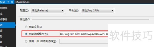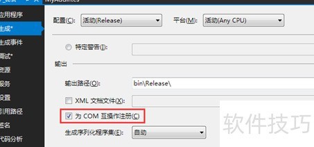 首次将Debug切换为Release时,需在项目属性中重新配置:生成选项中启用为COM互操作注册,调试选项中设置启动外部程序。