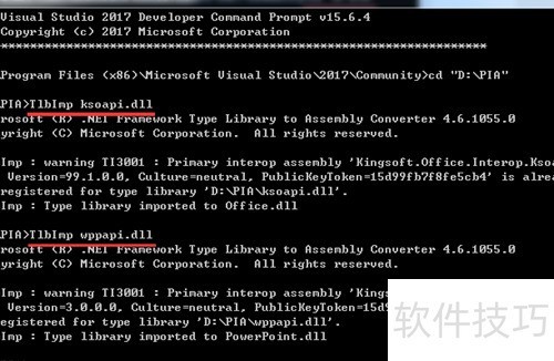 输入TlbImp ksoapi.dll并按回车,系统将在PIA文件夹中生成Office.dll;接着输入TlbImp wppapi.dll并回车,PIA文件夹中将生成PowerPoint.dll。确保命令正确输入,工具会自动完成类型库转换,生成对应的程序集文件,便于后续在项目中引用相关Office组件功能。