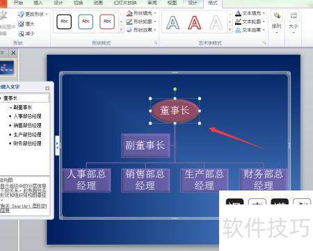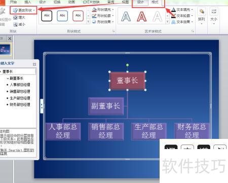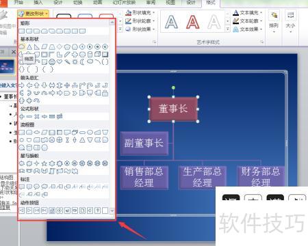 接着点击页面顶部的SmartArt工具中的格式,然后在下方菜单中选择更改形状选项。