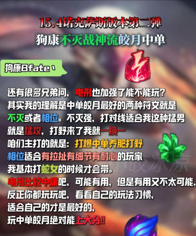 中路天赋 对线较肉中单,敌方坦度较大的阵容,预测打架时间较长可以考虑带... 皎月对线近战英雄的压制力还是较高的出装纳什之牙,法穿鞋,巫妖之祸出装...