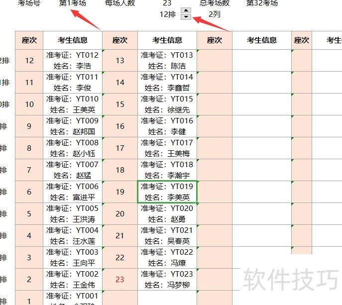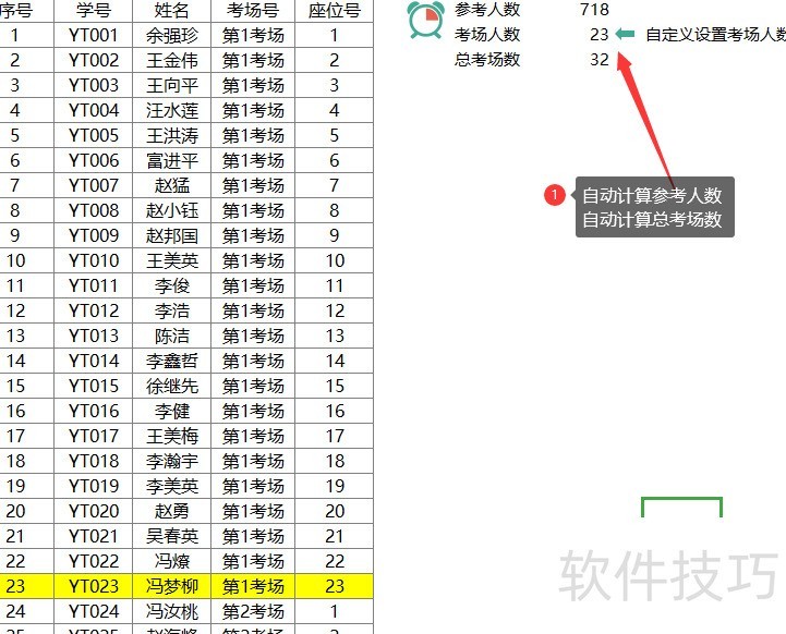 根据信息表成员总数确定参考人数和考场数量,计算考场号与座位号;姓名顺序可通过添加rand()函数生成随机序列后排序实现。