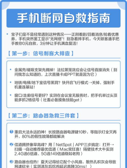 手机断网时,可尝试重启手机或路由器,检查网络设置是否正确,确认是否欠费或被路由器黑名单限制。若问题持续,可能是硬件故障或运营商问题,建议联系专业人员或运营商处理。