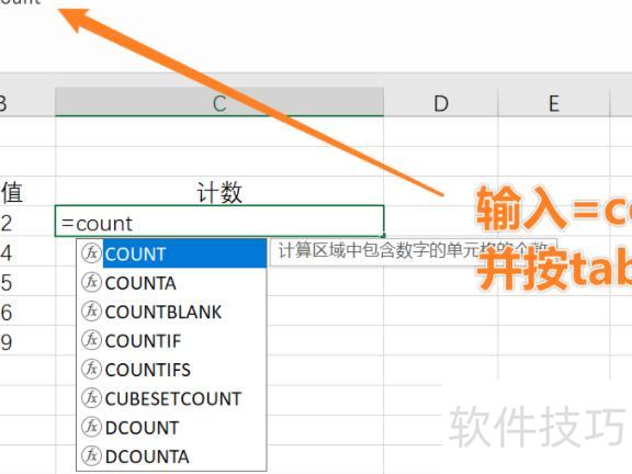 打开Excel,在单元格输入=COUNT,按下Tab键,若提示的第一项为所需函数,系统将自动补全。