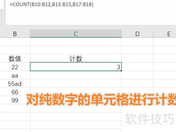 count函数用于统计参数列表中包含纯数字的单元格数量。