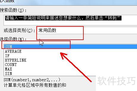 插入函数后,在弹出窗口中选择常用函数SUM,点击确定即可。