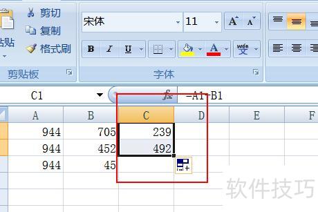 选中目标单元格,在编辑栏输入A2-B2,按回车即可完成减法运算并显示结果。