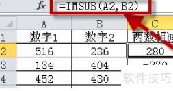 所示:用数字1减去数字2,C2单元格输入公式=IMSUB(A2,B2),按回车确认。然后选中C2单元格,将鼠标移至其右下角,待光标变为黑色十字后,按住左键向下拖动填充,即可快速复制该公式至下方单元格。