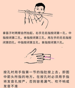 正确拿笛子需保持自然放松,双手垂直向下,大拇指托笛,小拇指固定定位,食指、中指、无名指用指肚按孔,指头不站于笛子上。左手大拇指在第6孔向膜孔方向1-2厘米处,右手大拇指在3孔正下方。