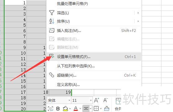 调出设置菜单后,选择设置单元格格式选项,进入相应设置界面。