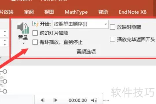 在音频选项中可设置播放时段、起始与结束动作,支持幻灯片播放模式,样式栏则用于调整音频外观样式,具体操作所示。