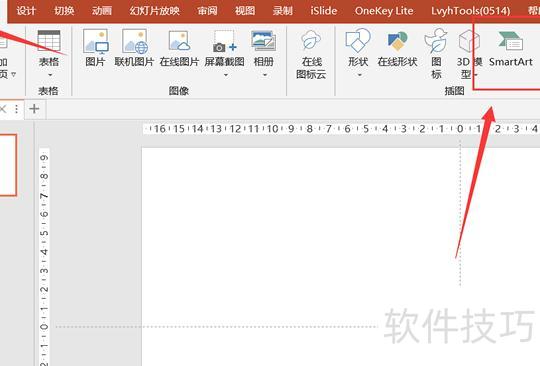 打开PPT,新建空白文档,点击插入选项,选择smartart图形并添加到页面中。