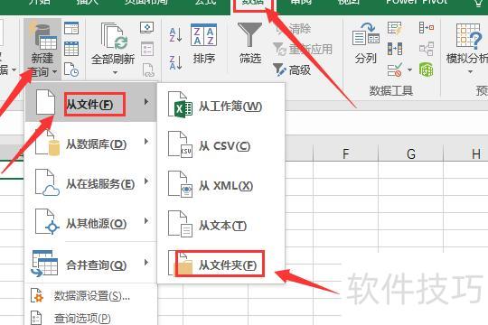 新建表格后,点击数据工具栏,选择新建查询,从文件夹路径导入并打开。