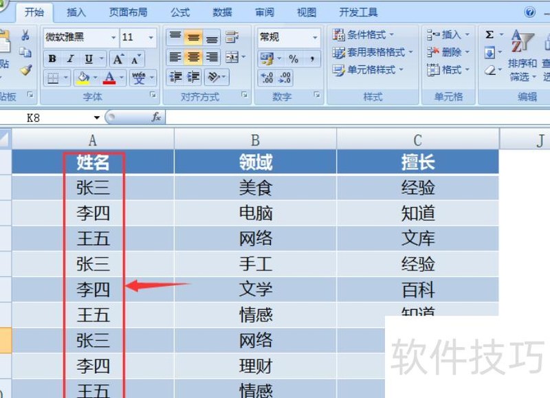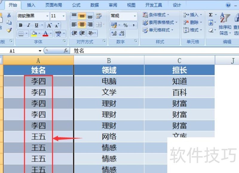 点击确定后返回Excel,姓名列中相同内容已自动归类排列。