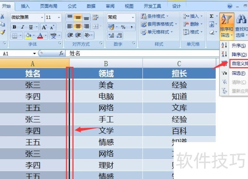 选中姓名列数据,以粗黑线为选中标志,依次点击开始选项卡中的编辑→排序和筛选→自定义排序。