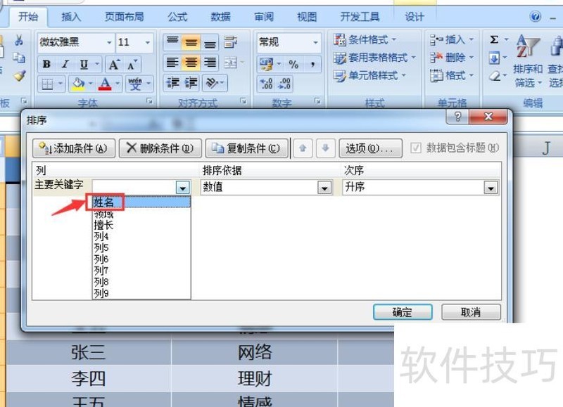 此时将弹出排序窗口,在主要关键字列中选择姓名,排序依据和顺序保持默认设置即可。