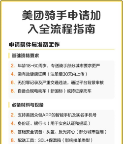 加入美团骑手需满足近6个月有3个月收入达当地社保缴费基数下限,平台补贴50%养老保险费用。可通过美团App或“美团骑手”小程序注册,完成实名认证、健康证明及培训后即可上岗。