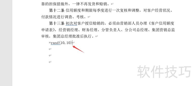 我们可在文档中输入函数=rand(10,10),表示生成10个自然段,每段包含10个完整句子的随机文章,用于测试排版或填充内容。
