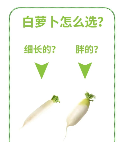 选购萝卜时,应选颜色洁白或米白、表皮光滑无裂纹、手感沉实的萝卜。避免表面光洁如玉(可能漂白)、手感轻飘(空心)、顶端发芽或有黑斑的萝卜。生吃口感清脆甘甜为佳。