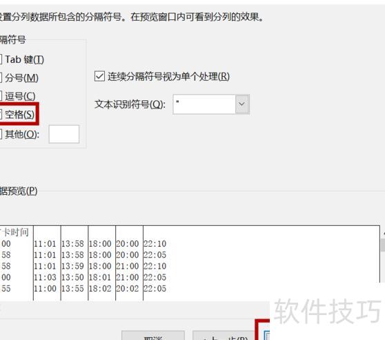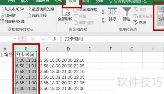 打开Excel,选中打卡时间整列,点击顶部数据菜单,选择下方的分列功能。