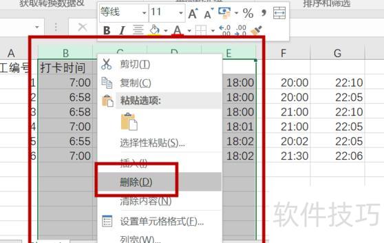 数据分列完成后,需手动判断,选中所有非加班时间的列,右键点击并选择删除。