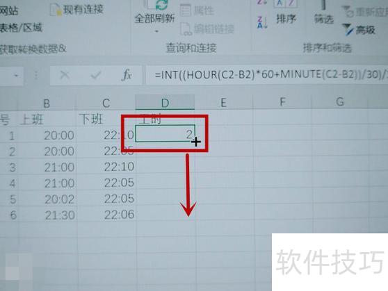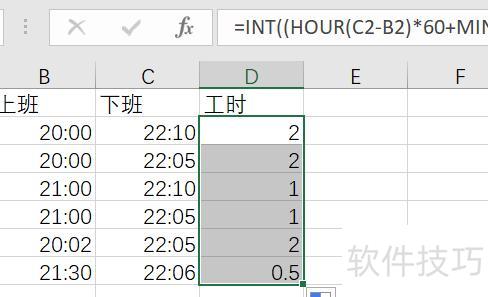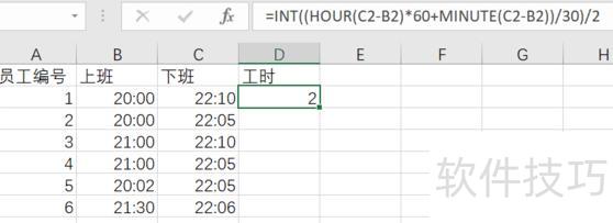 在对应工时栏中输入公式=INT((HOUR(C2-B2)*60+MINUTE(C2-B2))/30)/2,用于计算首项加班时长。