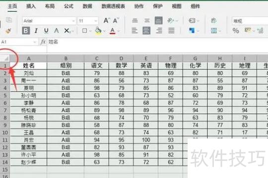 点击第1行与A列交汇处的倒三角,即可选中整个表格。