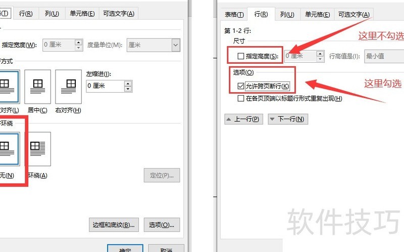 取消勾选段中不分页或与下段同页,表格即可恢复正常显示。