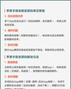 苹果手机发烫可通过清理后台程序、关闭不常用功能、避免长时间高负载运行及检查电池状态来缓解,必要时联系售后。