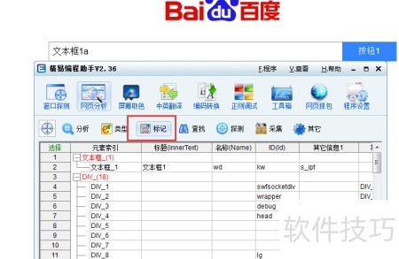 4、 以网络首页为例,分析首条结果后,选中文本框并开启标记功能,再次分析时系统会在原网页添加标注,直观展示关键元素,便于观察和理解内容结构与特征。