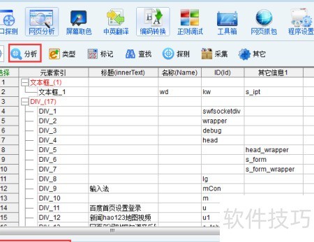 2、 使用瞄准镜工具拖拽至目标网页,点击分析即可自动识别并提取各元素类型。