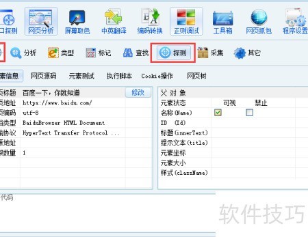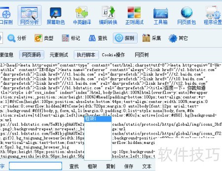6、 检测功能稍丰富些,只需用瞄准镜工具拖动至目标网页,即可显示该页面的元素信息与源代码,操作简便直观。