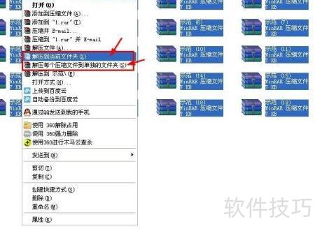 5、 演示如何批量自动解压多个压缩文件。选中所有需解压的文件,右键点击,选择解压到当前文件夹或解压每个压缩文件到单独文件夹,两种方式均可实现快速解压,操作简便,效果显著。