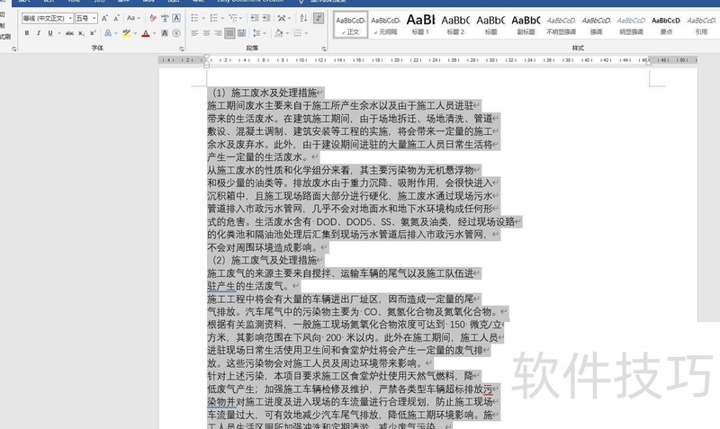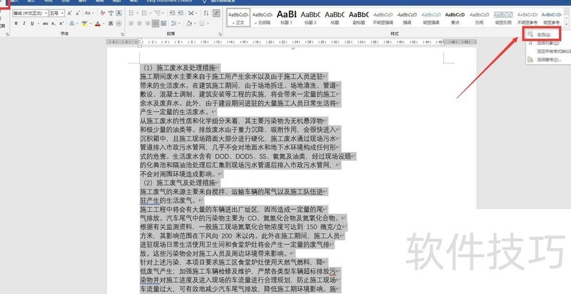 在开始工具栏右后方点击选择按钮,从下拉菜单中选取全选,即可选中全部文字。