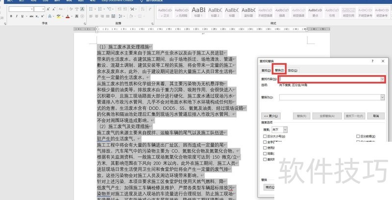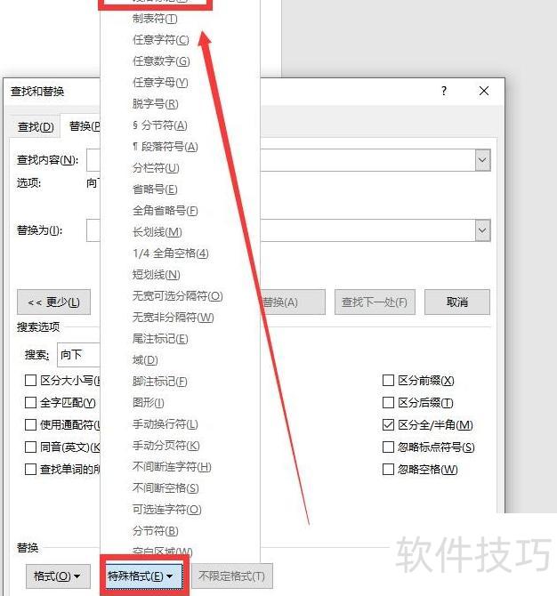 8、接着按Ctrl+H,在弹出的窗口中将光标置于查找内容框内,再向下滚动页面,找到底部的特殊格式选项。
