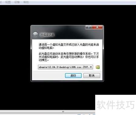 6、 选中Ubuntu1后,点击上方的启动按钮,界面将显示相应提示。随后选择已下载的Ubuntu虚拟光盘文件,确认并点击启动即可开始运行。